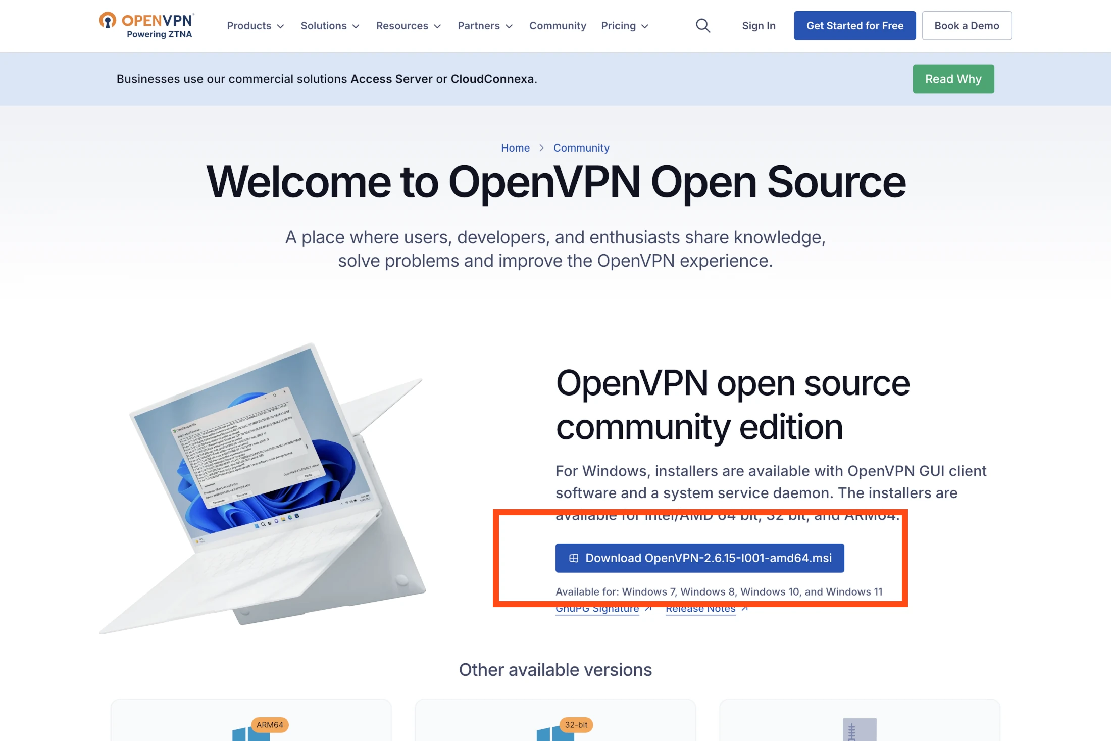 Für einen sicheren Zugriff auf das Firmennetz muss der OpenVPN-Client auf dem Windows-PC installiert und konfiguriert werden. Die Installationspakete des OpenVPN-Clients für Windows werden kostenfrei verteilt und sind auf der Seite "Community Downloads" der offiziellen Website verfügbar. Auf der Download-Seite die für das Betriebssystem passende Installerversion auswählen und die Datei herunterladen. In der Regel handelt es sich um den Eintrag "Windows 64-bit MSI installer".