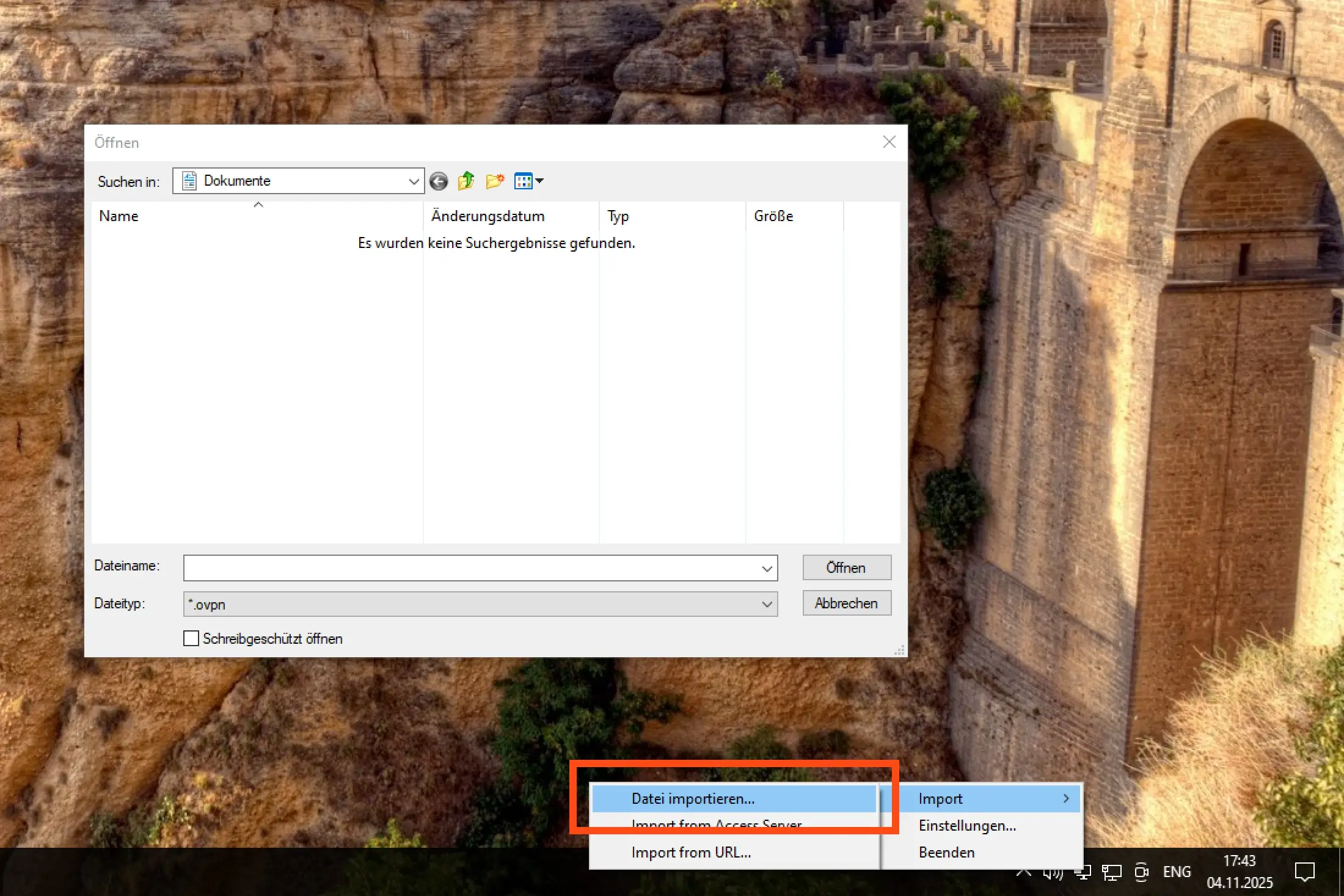 Das Kontextmenü von OpenVPN GUI öffnen Sie mit einem Rechtsklick auf das Programmsymbol. Zur Installation der Konfigurationsdatei wählen Sie den Menüpunkt "Datei importieren…" und öffnen die bereitgestellte Datei mit der Endung ".ovpn".